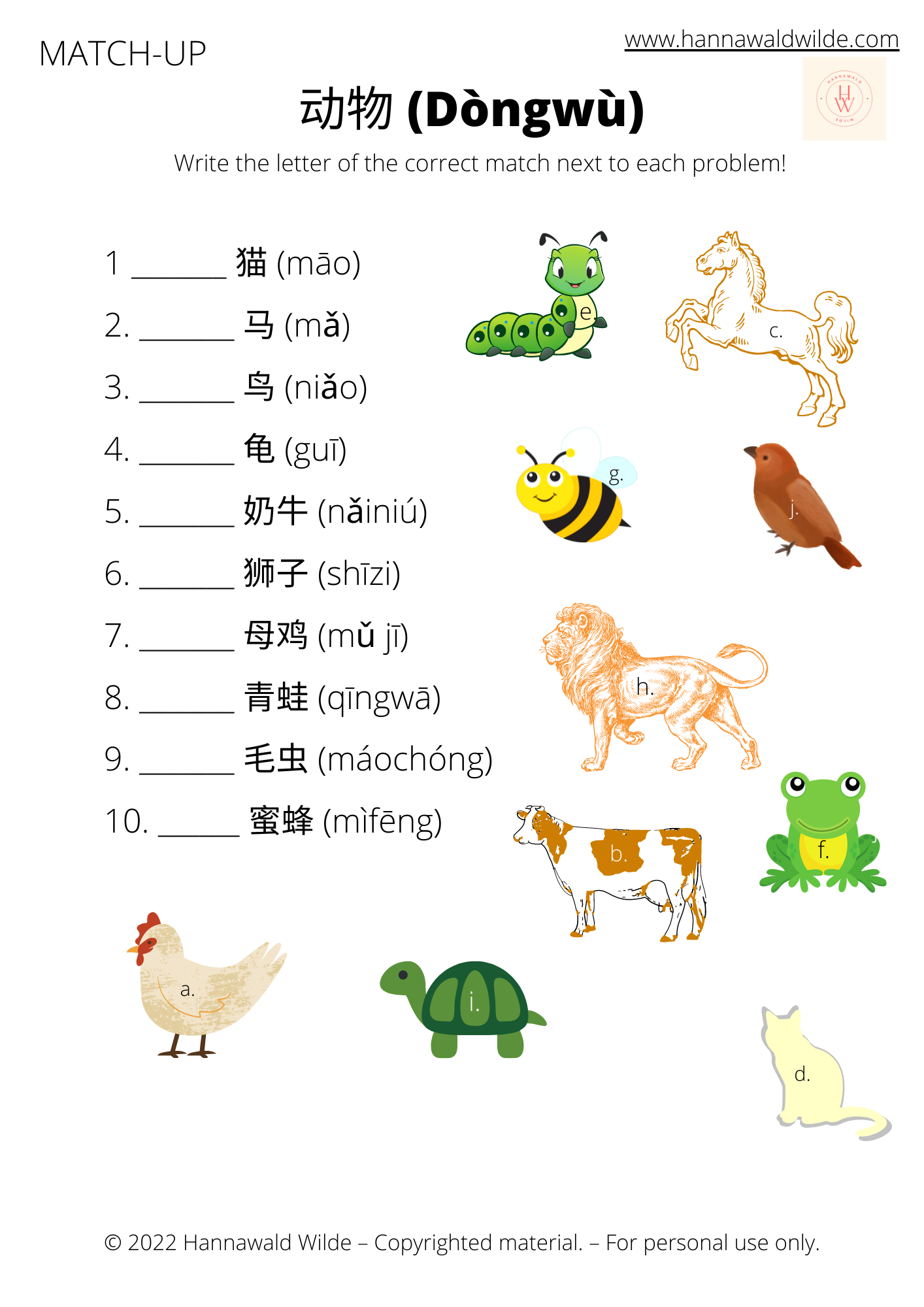 Here is a simple exercise about animals. Your job is to write the corresponding letters to the animal names.